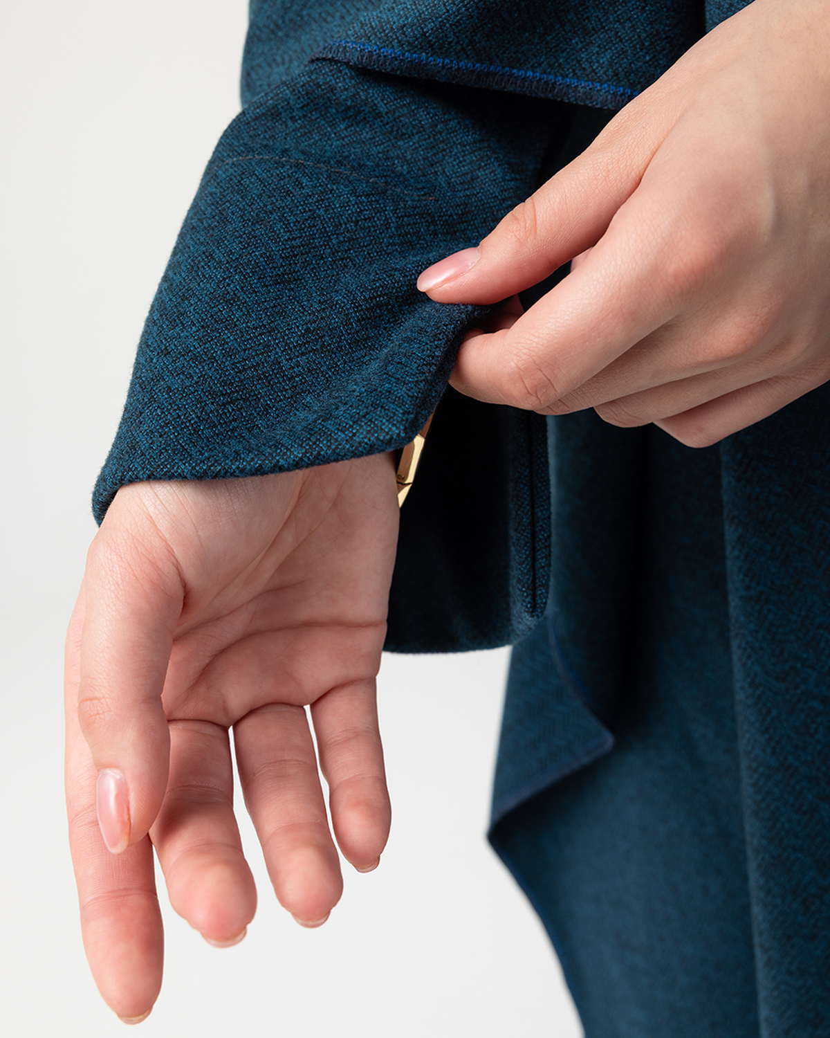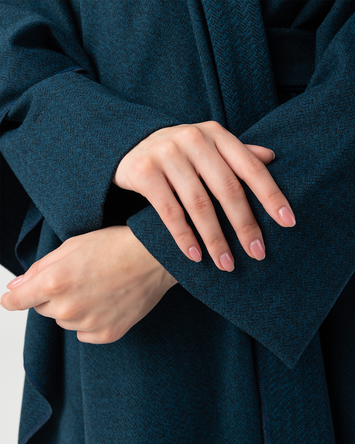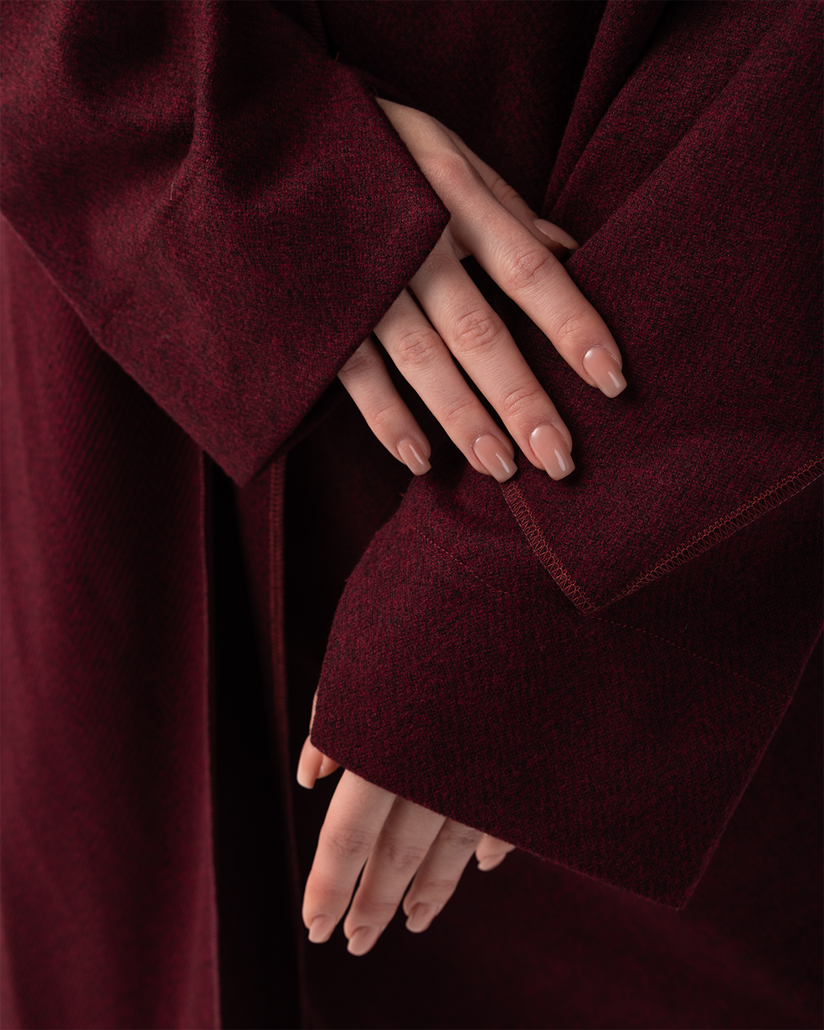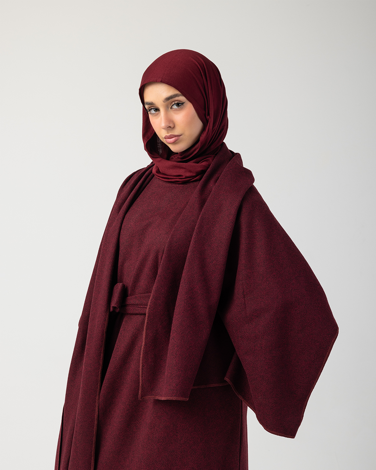 The attached layer can be styled in multiple ways, offering effortless variation from one look to another—cinched neatly with a matching fabric belt or left flowing for a softer expression. Long, wide sleeves and a structured yet modest cut provide warmth, movement, and confidence in equal measure.