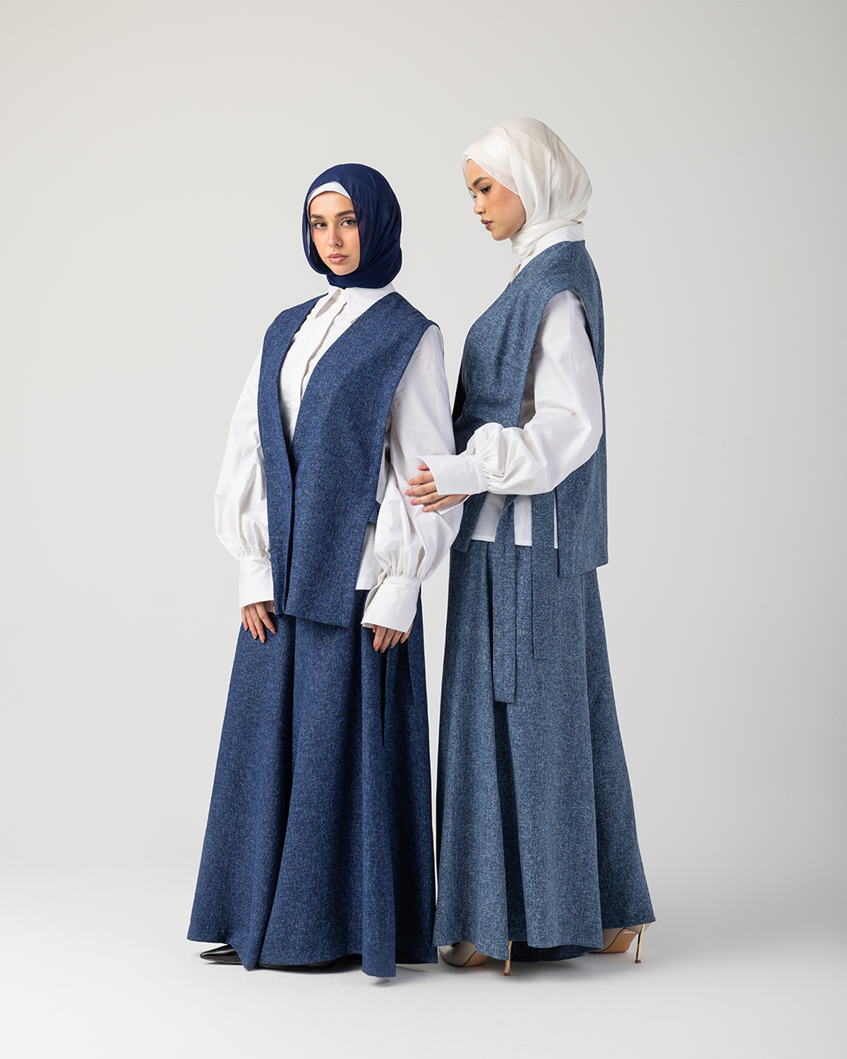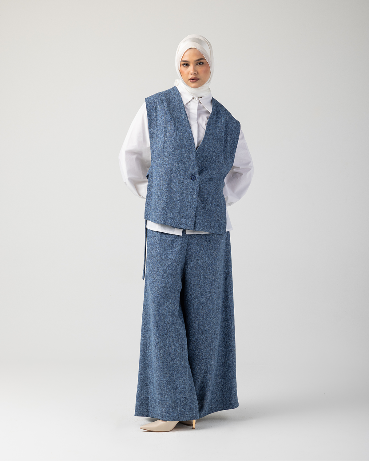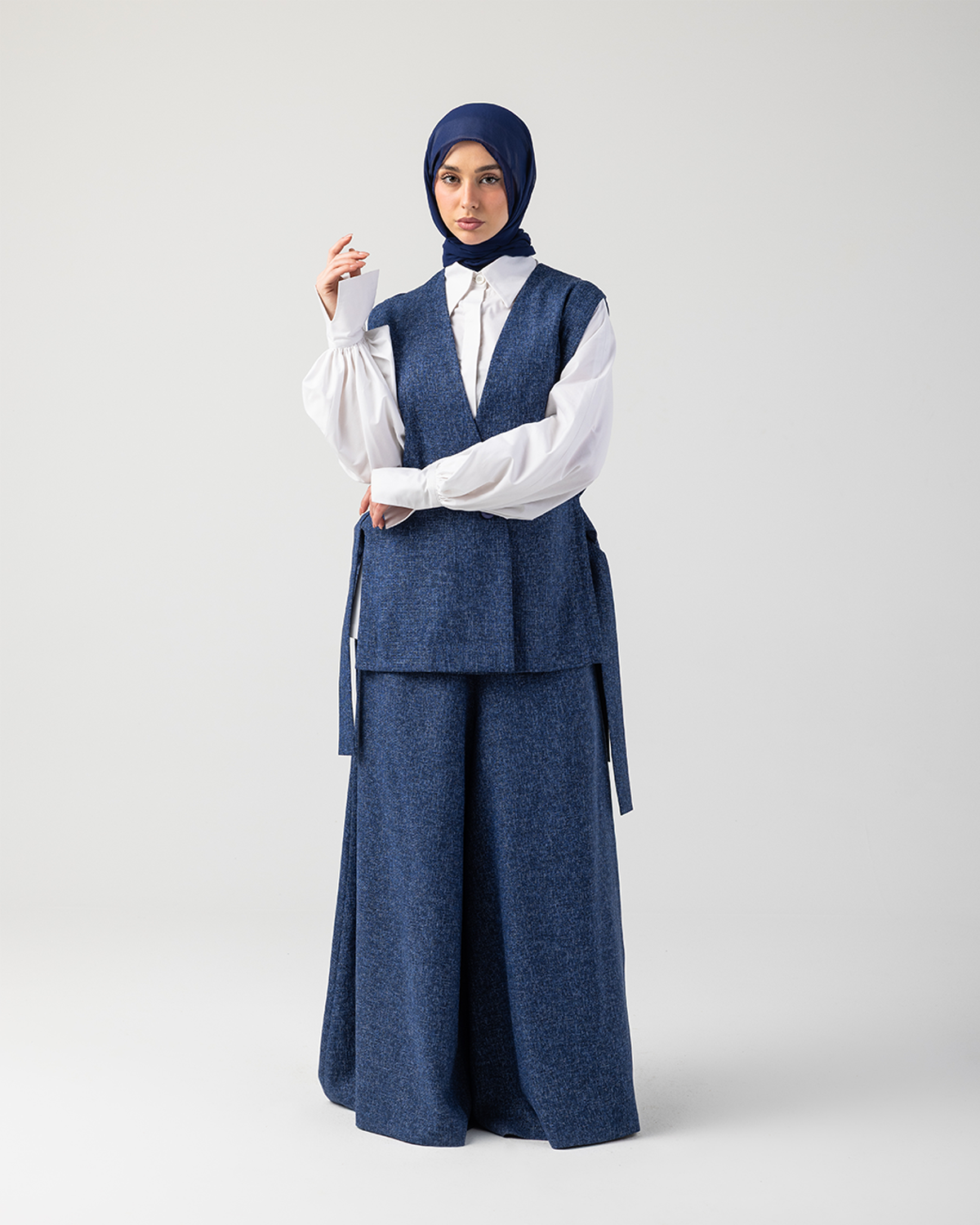 Rhea is a modern tailored set that embodies structured elegance with effortless modesty. Crafted from a premium cotton–wool blend, this two-piece ensemble features a refined vest paired with full-length wide-leg pants, designed to flow gracefully while maintaining a polished, architectural silhouette.