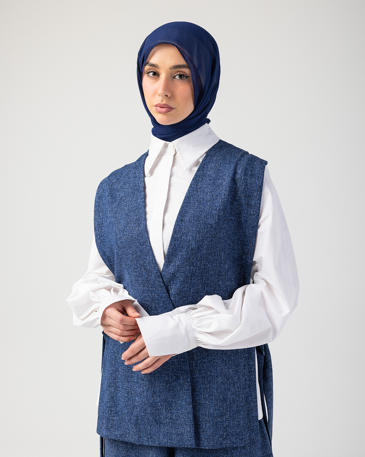 The vest is thoughtfully constructed with hidden internal buttons and adjustable side belts in the same fabric, allowing the fit to be subtly customized while preserving a clean, minimal look. Soft, breathable, and gently fluid, Rhea delivers comfort without compromising sophistication.